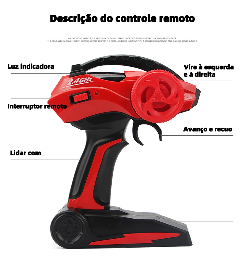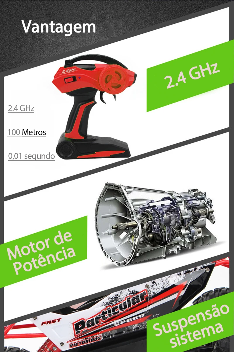 O Buggy Controle Remoto Automodelo RC é equipado com tecnologia avançada para proporcionar uma experiência de condução excepcional. Seu motor potente e tração nas quatro rodas garantem um desempenho surpreendente e velocidades impressionantes.